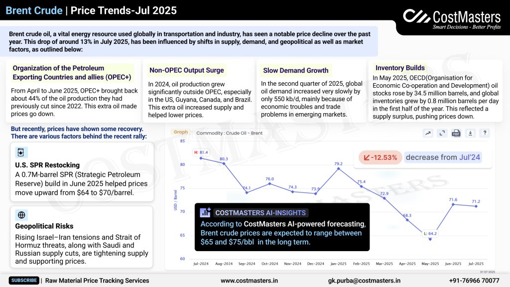 Brent crude — the go-to benchmark for oil prices worldwide — has hit a bit of a rough patch this year. As of July 2025, prices are down by around 13% compared to the same time last year.