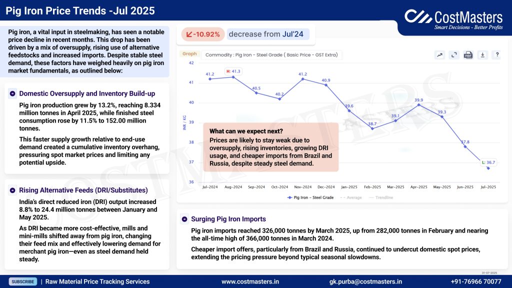 The pig iron market is facing a tough combination of rising domestic production, shifting buying patterns, and import competition. Unless there’s a major shift in steel demand or policy interventions to curb imports, pig iron prices may remain under pressure for the foreseeable future